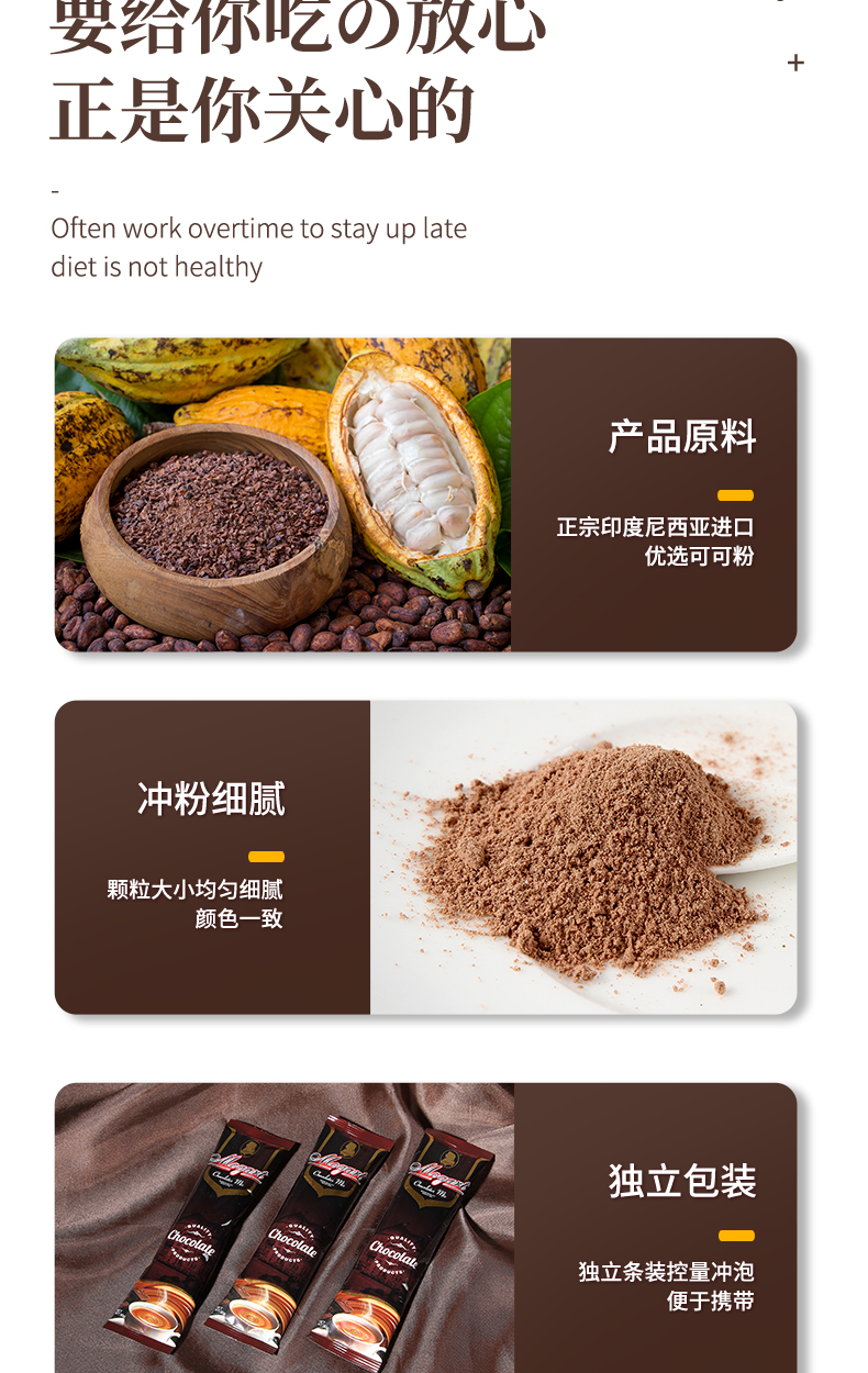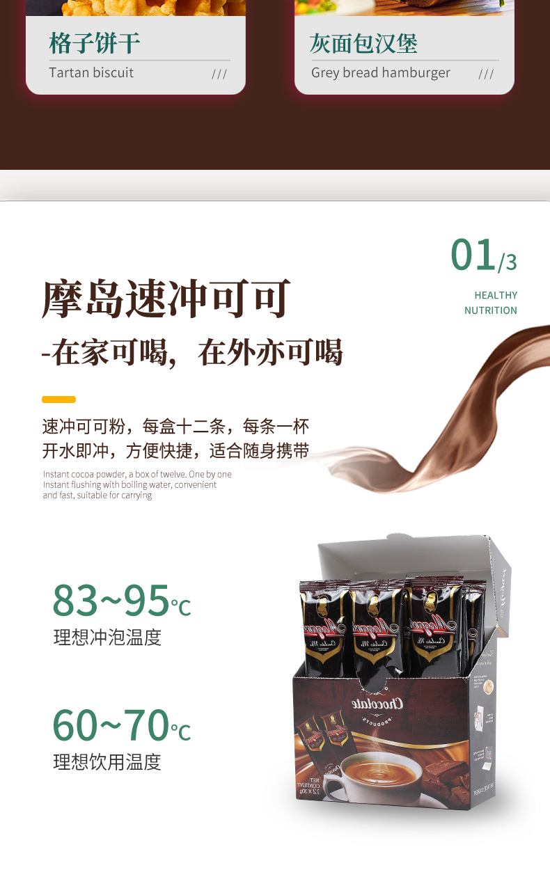 冲泡起来非常简单快捷,只需一点热水,就能迅速溶解成一杯香浓可口的可可饮品。原味纯正,不添加过多糖分,保留了可可最本真的味道,喝起来既满足又不会有负担。