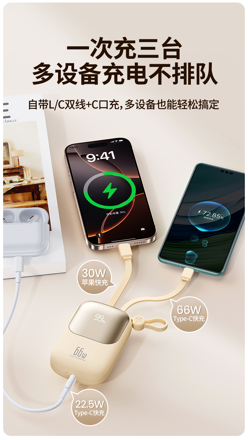 - ¥69.90米黄,尊享版【66W超级快充 提速300%】可充手机/耳机/手表,20000mAh