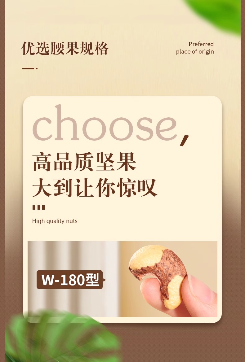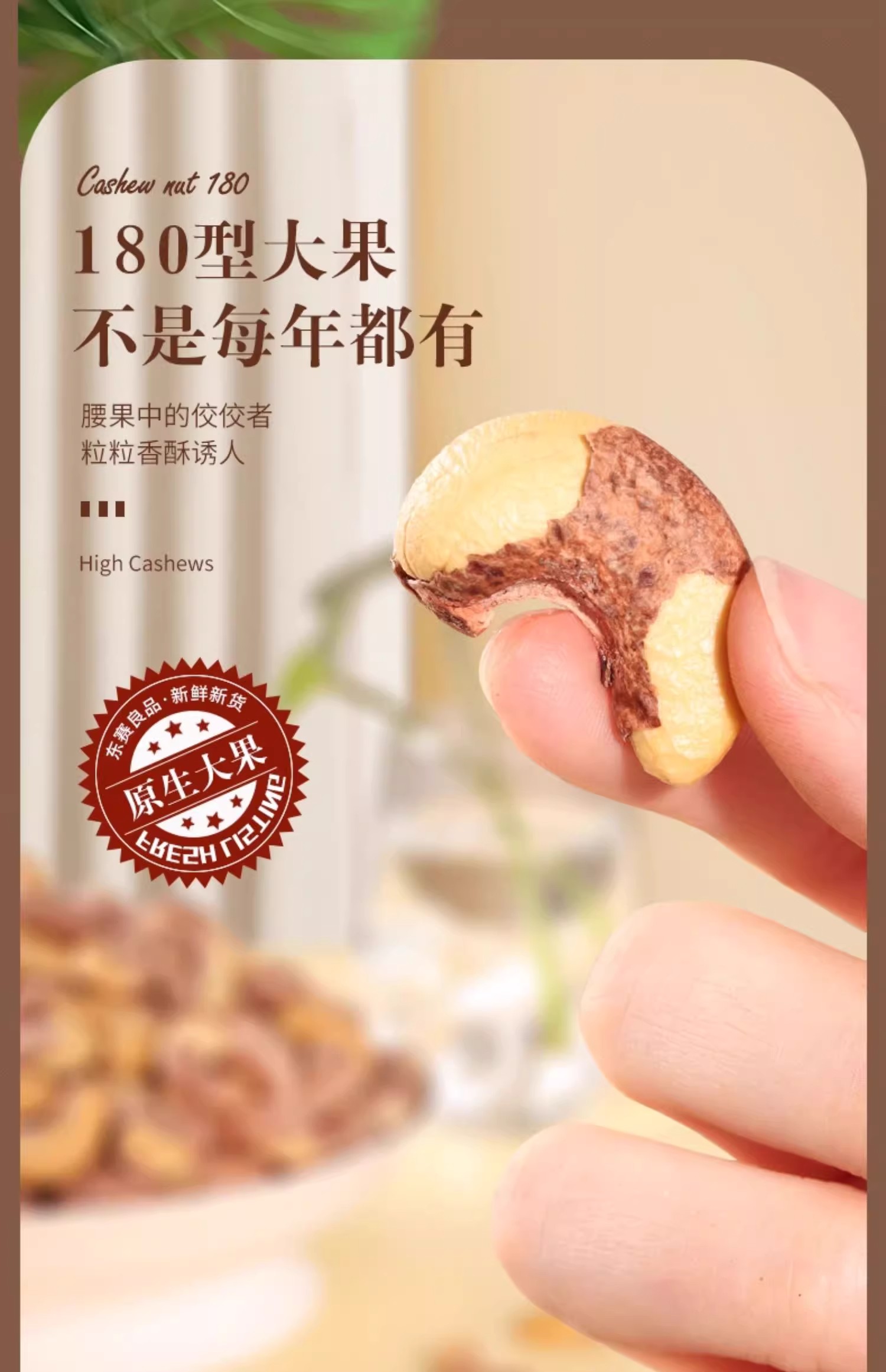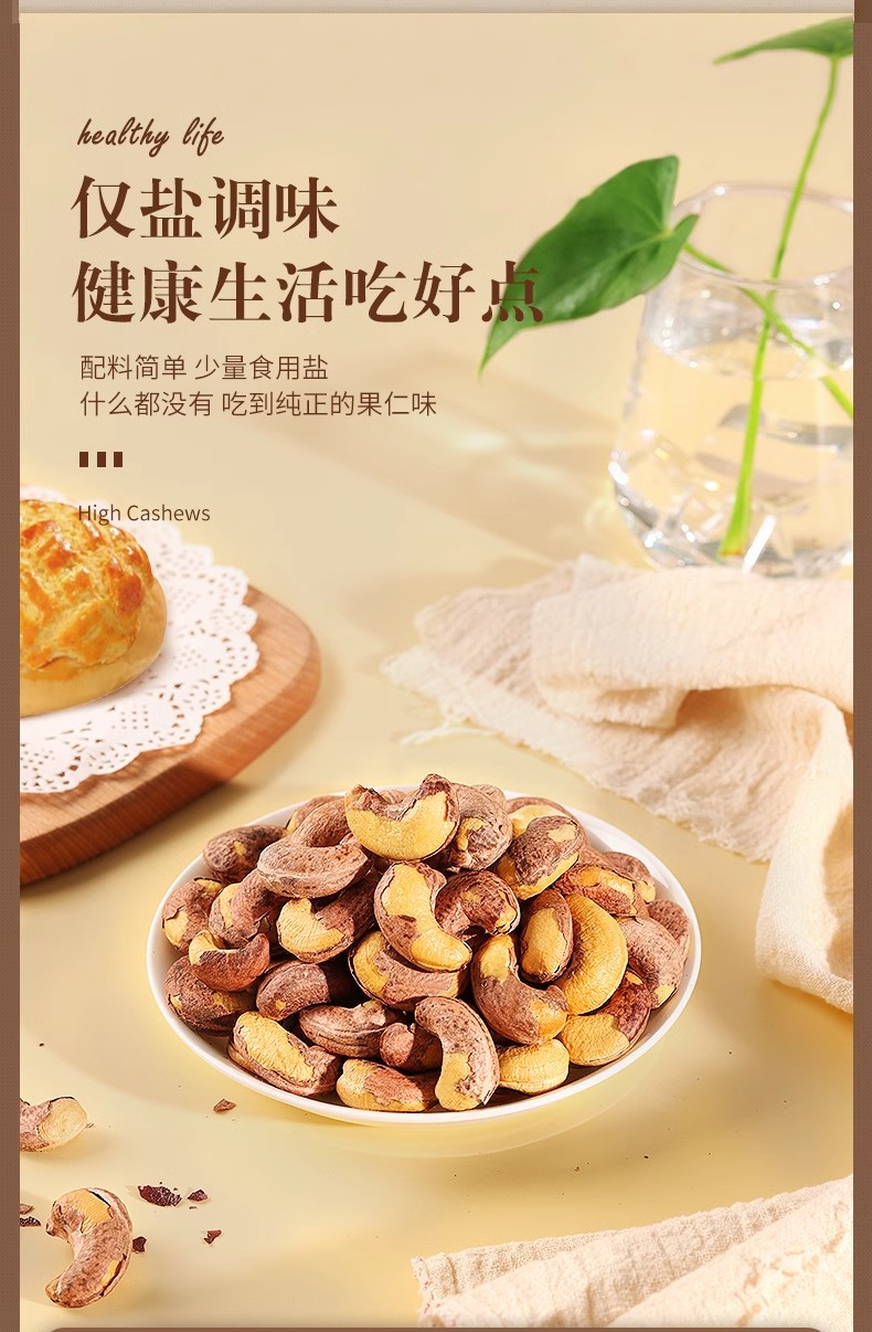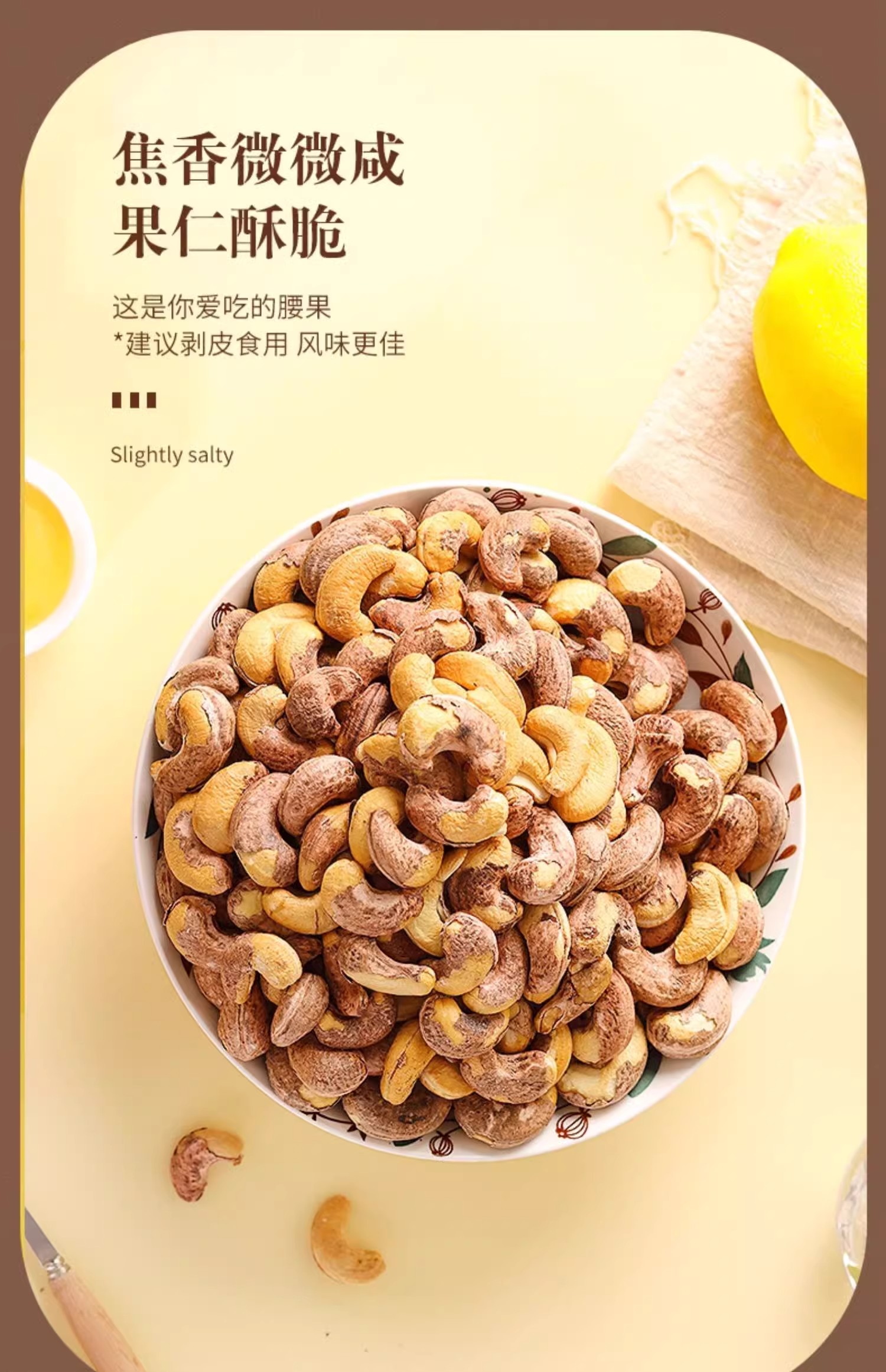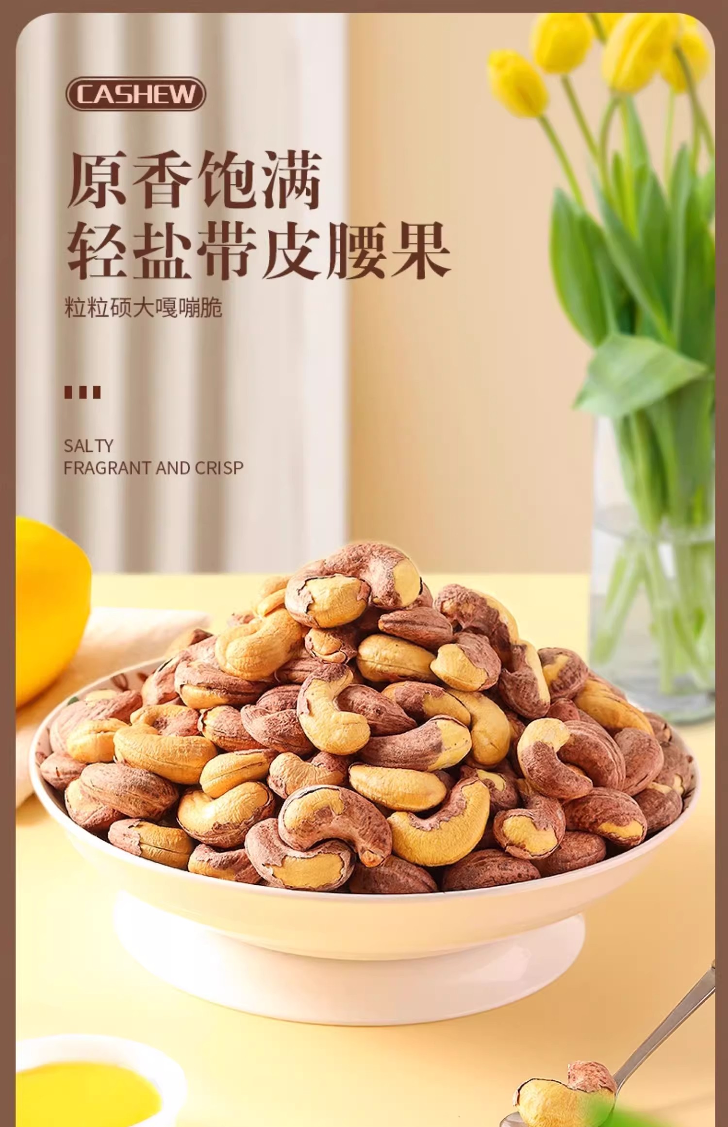 超值大颗粒盐焗腰果,美味与健康并存! 评论内容: 非常满意这次购买的带皮腰果!首先,收到货时发现包装完好无损,罐装设计既密封又方便存放,保持了腰果的新鲜度。打开罐子那一刻,浓郁的盐焗香味扑鼻而来,真是让人垂涎欲滴。 特别要提的是,这款腰果标注为A180大颗粒,确实名副其实,每一颗都饱满均匀,带皮食用不仅保留了腰果的自然风味,还增添了一丝独特的口感。紫衣腰果仁在盐焗的烹饪下,既保留了腰果本身的清甜,又融入了恰到好处的咸香,吃起来既不过分油腻,也不失坚果的香脆,作为休闲零食简直是完美选择。 而且,500g的分量对于个人享用或是家庭分享都十分合适,价格方面,28.9元的价格相较于市面上同类品质的产品来说,性价比极高,感觉非常划算。这次购物体验非常满意,无论是从商品质量、包装还是价格上,都超出了我的预期。 此外,这款腰果还是商超同款,品质有保障,让人吃得放心。无论是自己享用还是作为礼物送给亲朋好友,都是不错的选择。已经推荐给周围的朋友了,希望商家能一直保持这样的品质和服务,下次还会再来光顾的!