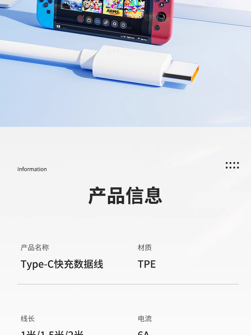 - ¥7.99单线【1.5米】白色Type-c【6A超级闪充】,120W,6A