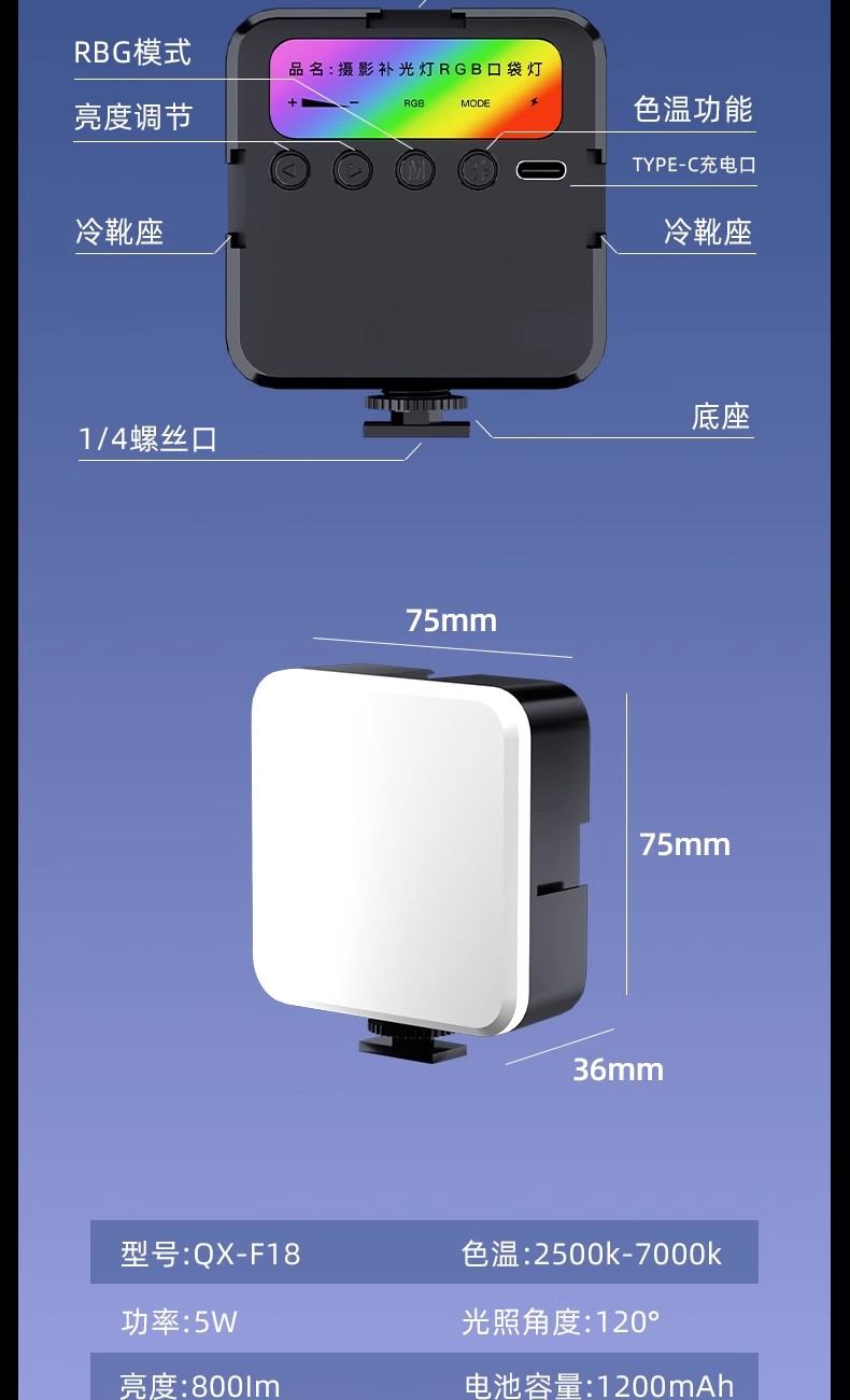 - ¥37.00【RGB全彩色款】补光灯+热靴+夹子