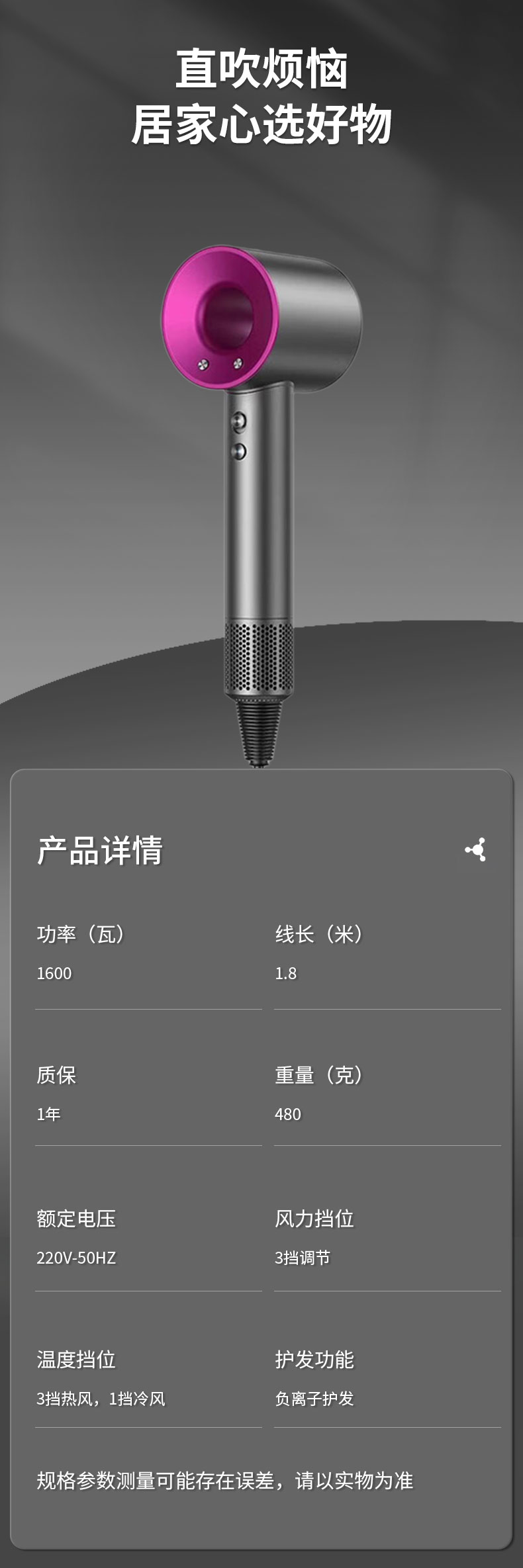 - ¥75.00太空灰,吹风机+顺滑风嘴+礼盒+1.8m线