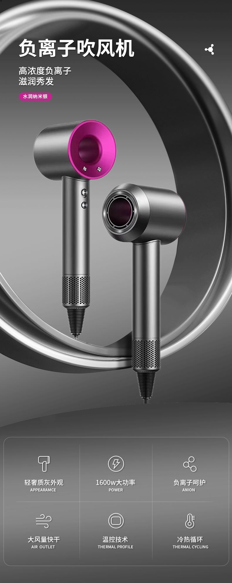 - ¥98.00太空灰,吹风机+五个风嘴+礼盒+1.8m线