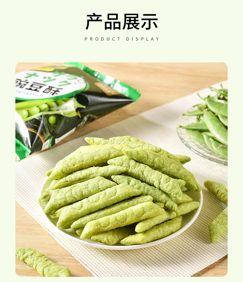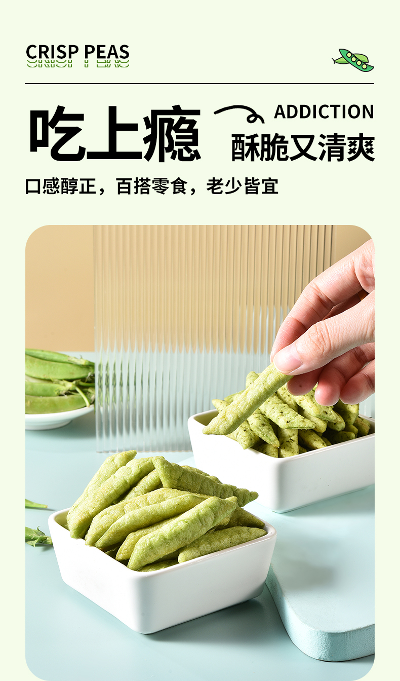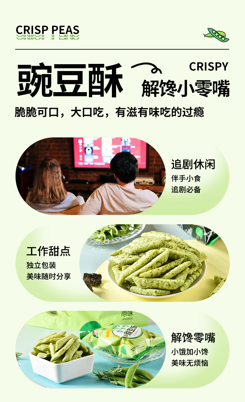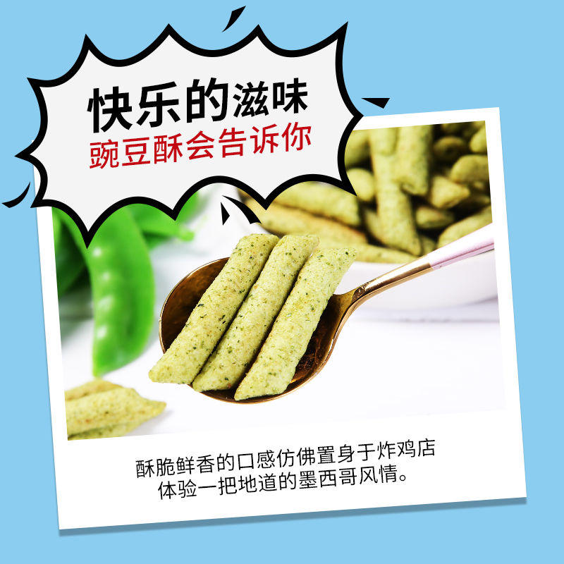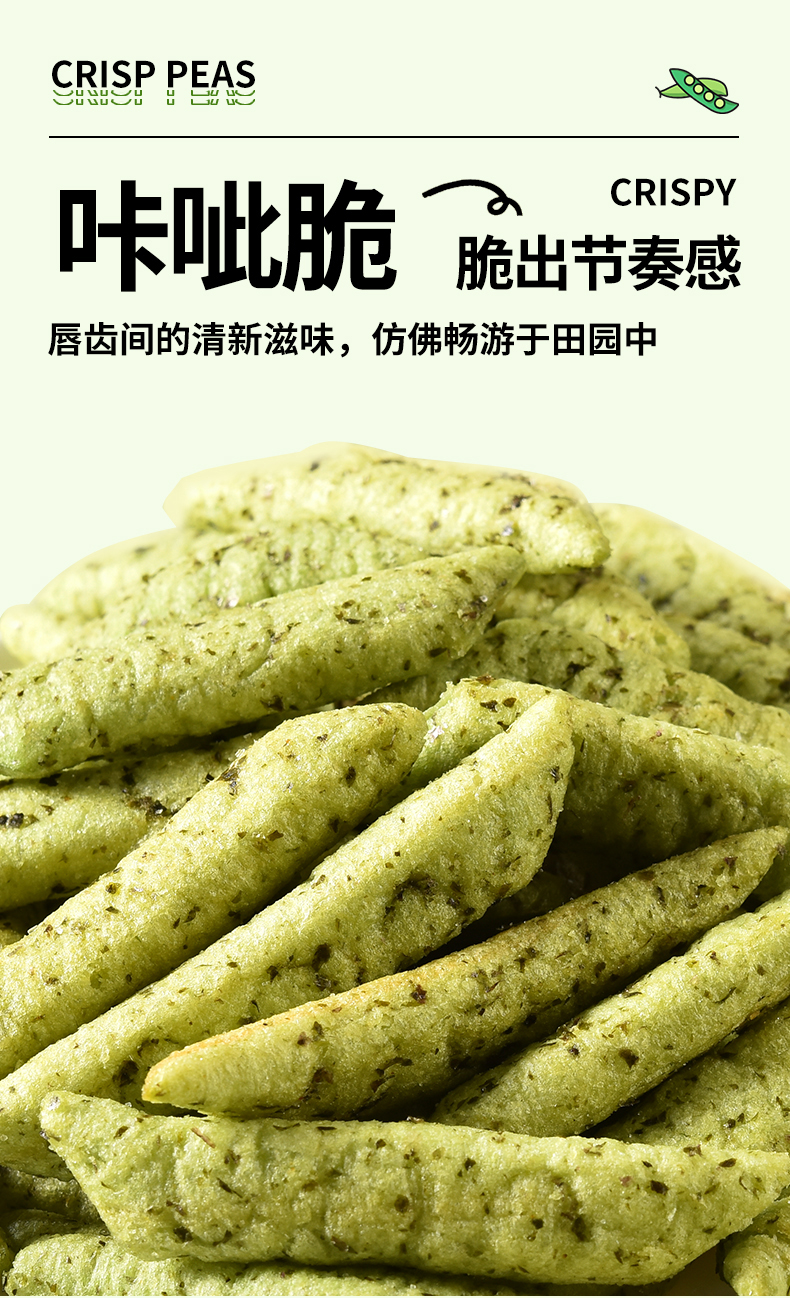 酥脆可口,非油炸膨化食品,添加50%豌豆粉,口感醇正,百搭零食,老少皆宜。2种口味,追剧休闲必备小零食