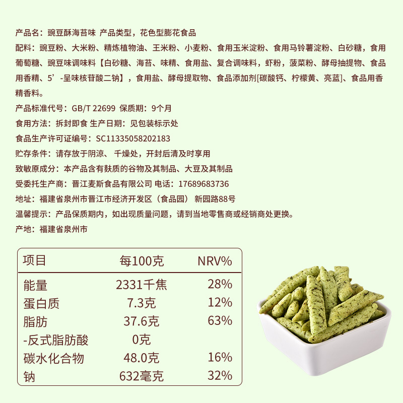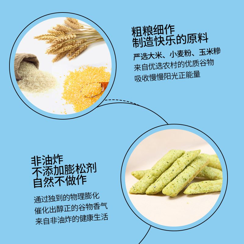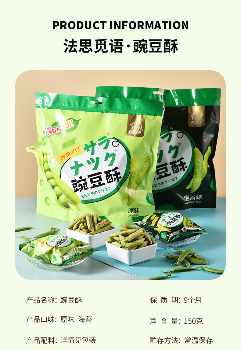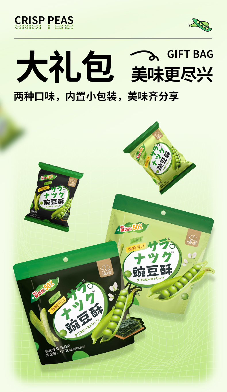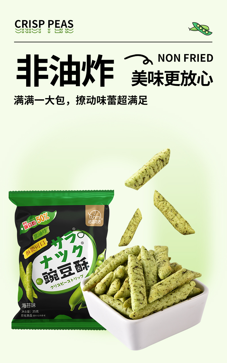 酥脆可口,非油炸膨化食品,添加50%豌豆粉,口感醇正,百搭零食,老少皆宜。2种口味,追剧休闲必备小零食