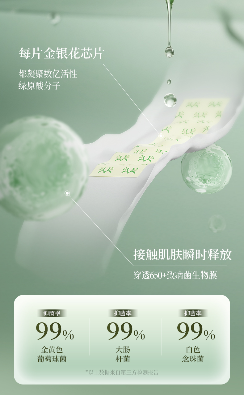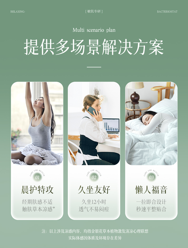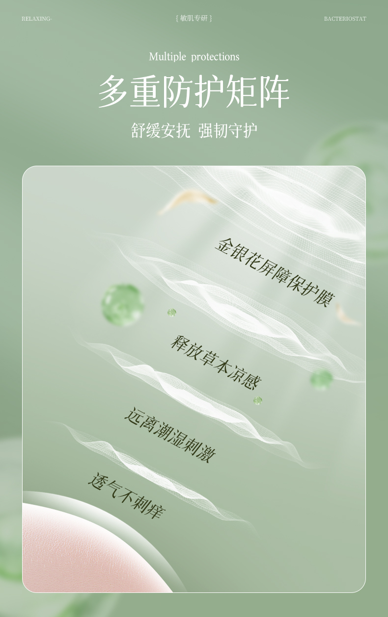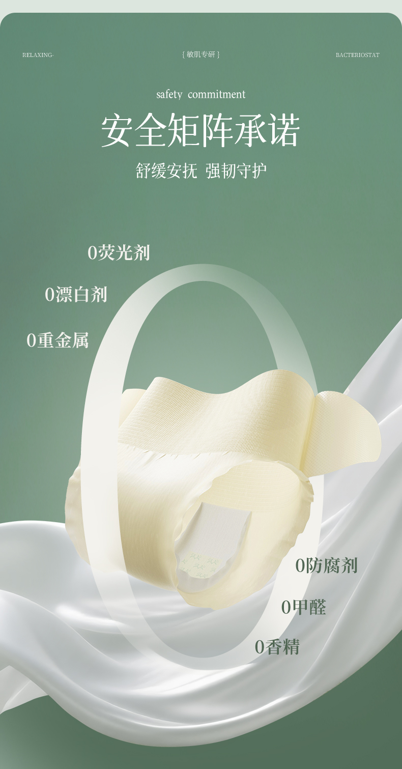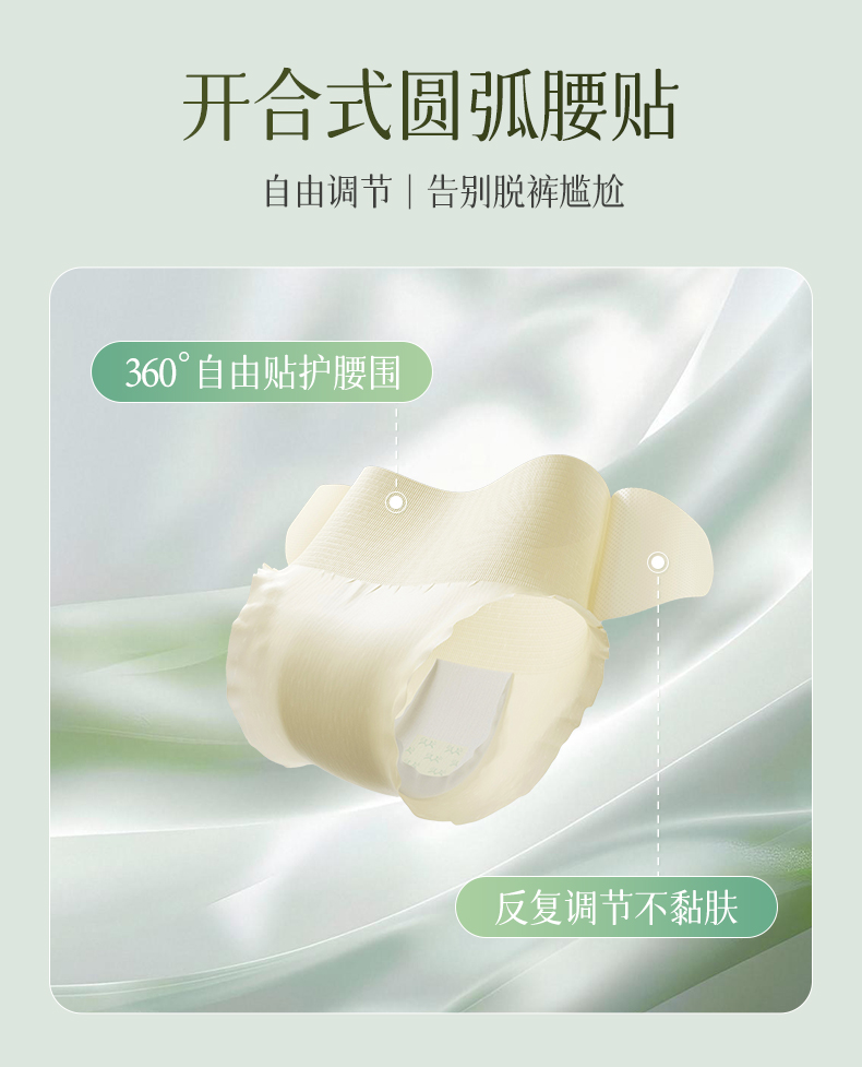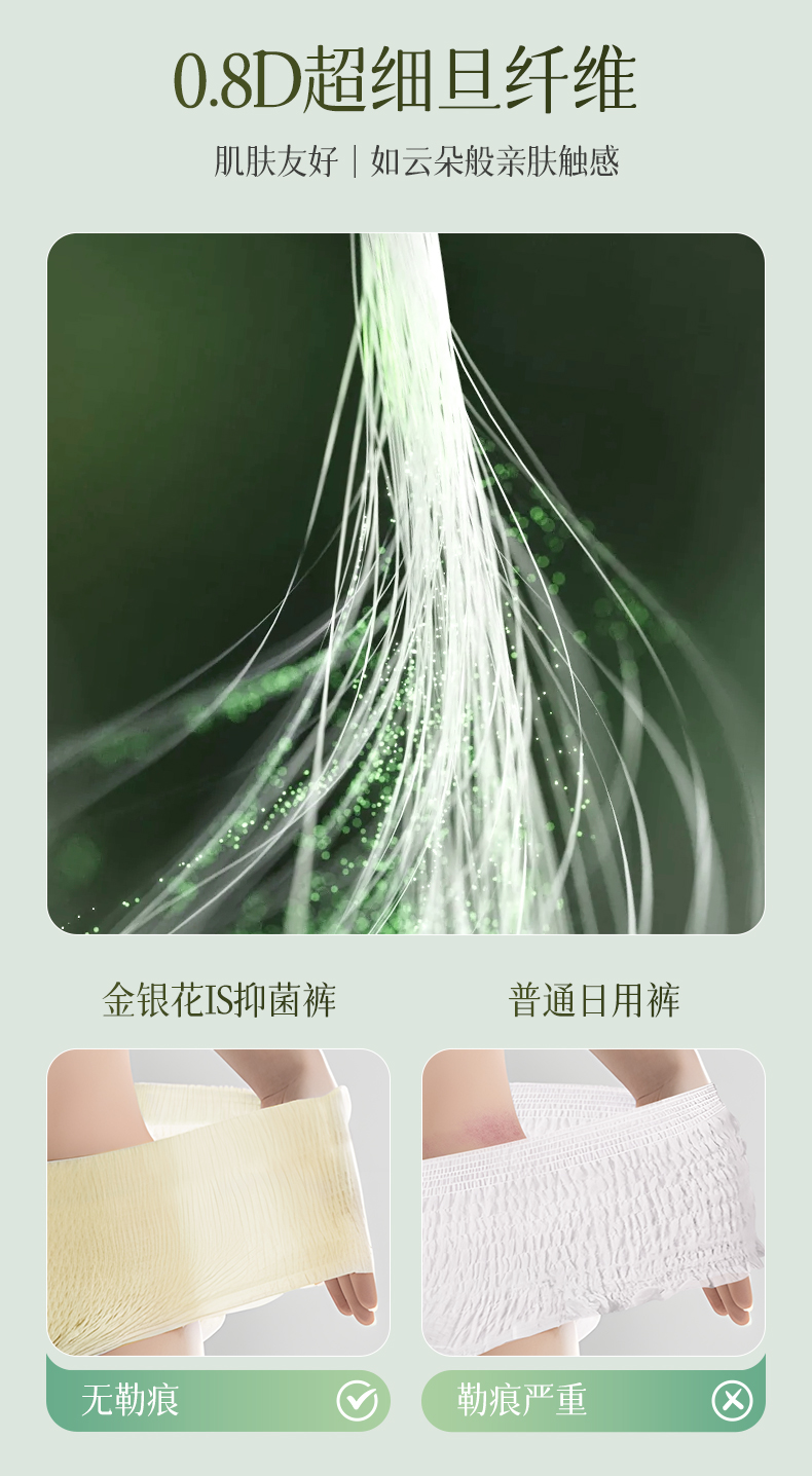 1、草本植护,有效减少私处潮湿问热,减少异味。对易敏人群非常友好。2、0.8D超细旦纤维面层 婴儿级细软丝柔+六层芯体构造+金银花抑菌芯片,层层呵护不断层不起坨 亲肤透气,有效呵护小花园娇嫩肌肤。高弹柔软 两侧带魔术贴腰围,(一开 一撕 一贴 一提)四个步骤轻松更换)更换3、不脱裤。且腰围,采用超细旦纤维空集橡,不勒皮肤。无需担心留印
