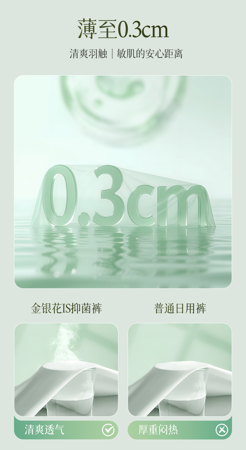 4、超薄巾体,薄至0.3cm,科学腰臀比例,跟小内内一样轻柔舒适目透气,超长巾身420mm吸收体 裤型结构,360度防漏,日夜都可穿。
