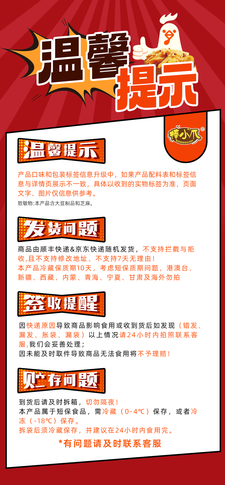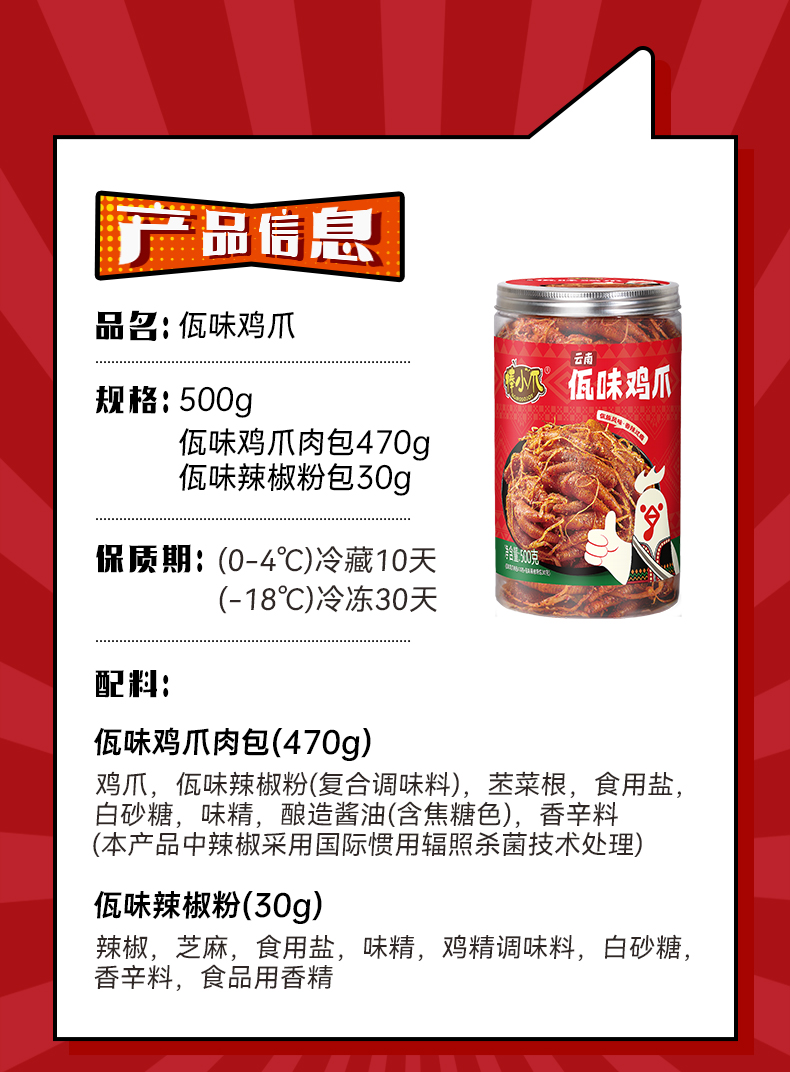以下是根据商品信息生成的5条不同风格的买家评论: --- **评论1(热情推荐型)** 收到货立刻拆开尝了!不愧是正宗云南佤味鸡爪,鸡爪个头超大,肉质Q弹有嚼劲,香辣味调得刚刚好,辣得过瘾又不会呛喉咙!500克分量超足,配的辣椒粉还能自己加量,追剧时一口一个根本停不下来!价格才29.9,比超市划算多了,7天发货也很快,已经安利给闺蜜了! *** **评论2(细节体验型)** 包装很严实,收到时冰袋还没化。鸡爪是纯凤爪,没有碎骨和边角料,处理得很干净。470克鸡爪+30克辣椒粉的搭配很贴心,能吃辣的多撒点,不能吃辣的少放点。味道是云南特色的酸辣口,后劲有点麻,越吃越上瘾!29.9元这个品质真的值,会回购! *** **评论3(对比评价型)** 之前买过其他家的佤味鸡爪,要么太咸要么不够辣,这款完全超出预期!鸡爪肉厚且入味,辣中带香,嚼起来弹牙不软烂。500克一盒够吃两三天,配的辣椒粉是灵魂,撒上后香辣味直接升级!价格比实体店便宜近一半,7天发货也能接受,毕竟新鲜制作需要时间,推荐! *** **评论4(家庭分享型)** 周末家庭聚会买了两盒,结果被抢空了!大人小孩都爱吃,鸡爪处理得没有腥味,辣度对广东人来说稍微有点重,但配上自带的辣椒粉正好。500克分量很实在,鸡爪占比高,不是那种掺很多配菜的。29.9元一盒性价比超高,已经囤了三盒留着过年吃! *** **评论5(幽默风趣型)** 这鸡爪是来报恩的吧?!肉多到快溢出来,啃起来超满足!香辣味直接给我送走又拉回来(不是),辣得头皮发麻但停不下嘴!30克辣椒粉是“自虐包”吗?我全撒了,结果边啃边灌冰可乐……29.9元买不了吃亏买不了上当,但能买到快乐!7天发货等得值,建议商家出“变态辣”版!
