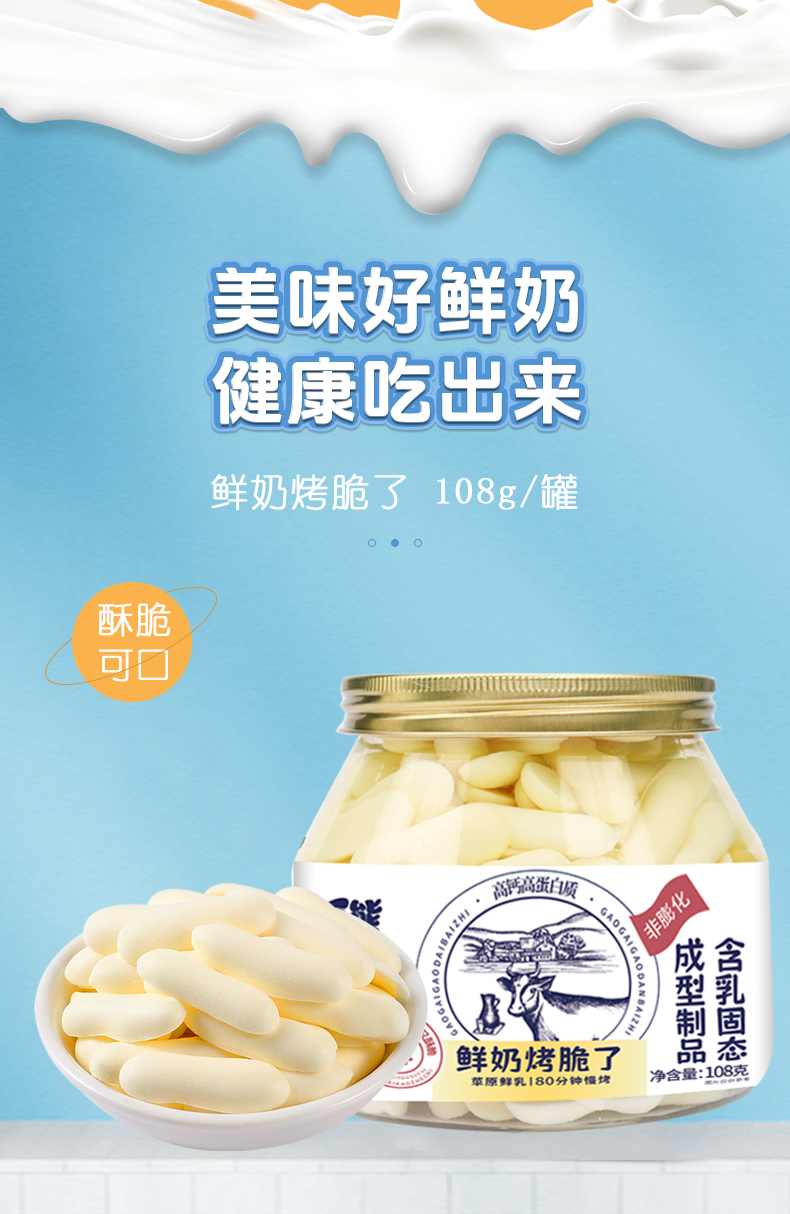 自从给孩子买了这款鲜烤奶片,家里的小宝贝就爱不释手,每次打开那小巧精致的108g罐装,都能闻到一股来自草原的清新奶香,真是让人垂涎欲滴!首先说说包装,密封性做得很好,保持了奶片的新鲜度,每次打开都像是刚从烤炉中取出的一样新鲜。 口感方面,这款奶片烤制得恰到好处,既保留了鲜奶的醇厚又不失嚼劲,每一口都是满满的奶香与自然的甜味,没有添加过多的糖分,吃起来健康又放心。作为高钙高蛋白的休闲零食,它不仅是孩子们的小确幸,也成了我工作间隙的能量补给站,大人小孩都适宜。 价格方面,单罐15.9元的价格虽说不算便宜,但考虑到它的品质与营养价值,绝对物有所值。而且,购买多罐还有优惠,2罐29.9元,3罐仅需39.9元,性价比极高,非常适合家庭囤货或是与朋友分享。 最让我满意的是,这款奶片作为零食,既满足了孩子的口腹之欲,又不用担心影响健康,因为它不含任何人工添加剂,纯粹的高钙高蛋白,对孩子的成长发育大有裨益。每次看到孩子吃得开心又健康,作为家长的我心里别提多满足了。 总之,这款鲜烤奶片无论是从味道、营养、价格还是包装上,都给了我和家人极大的惊喜,绝对是值得回购的健康零食佳品!强烈推荐给正在寻找高品质儿童零食的家长们!