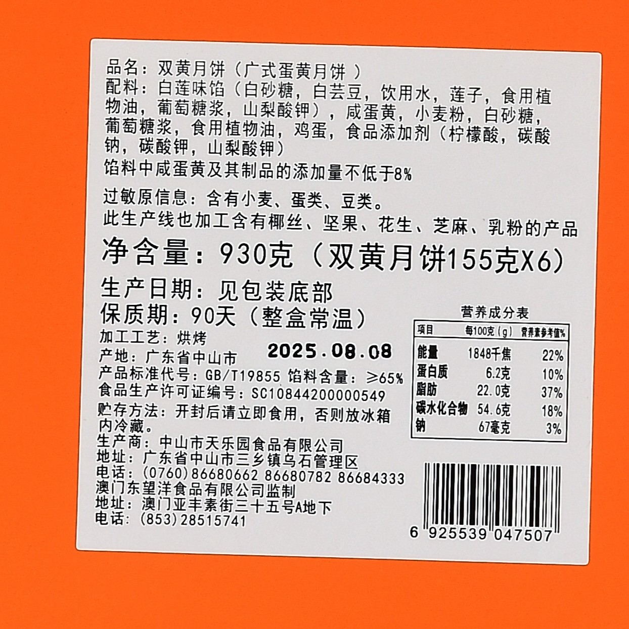 【澳门颂月】东望洋广式双黄莲蓉月饼6个/盒930g升级大礼盒装团购